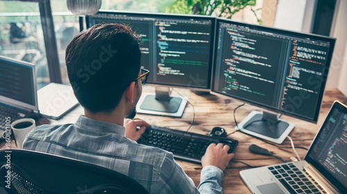 Young Programmer Debugging Code on Multiple Monitors, Young IT Professional Debugging and Enhancing Algorithms on Multiple Monitors in High-Tech and Modern Workspaces, Coding, C++, JavaScript, Python