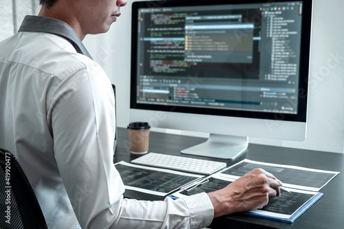 Young Programmer working in software javascript computer in IT office, Writing codes and data code website and coding database technologies to find solution to problem