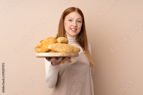 Young redhead woman in chef uniform. Female baker holding a table with several breads with happy expression