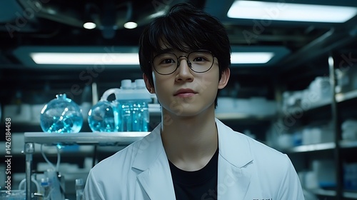 Young Scientist in a Laboratory with Scientific Equipment and Glassware for Research Purposes