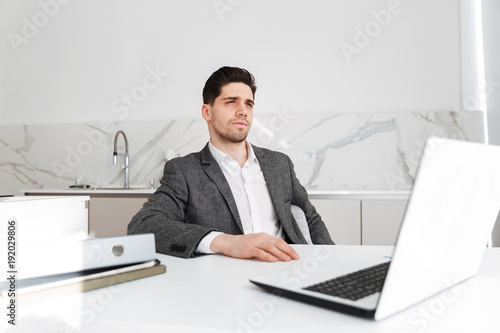 Young serious businessman using laptop computer