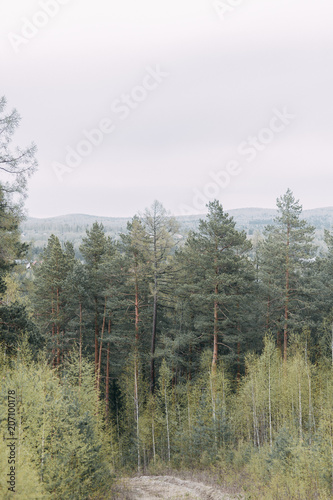 Young stylish couple in the forest, running around the Park and laughing. Modern people on a walk. Beautiful girl with tattoos. Loving young man and girl. mountain Park with pine forest