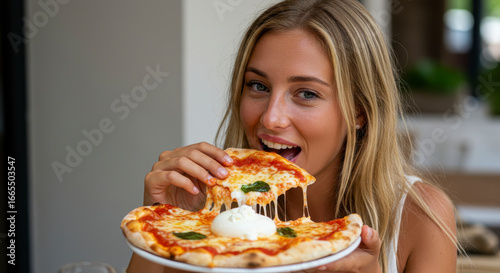 Young Woman Enjoying a Delicious Slice of Melty Cheese Margherita Pizza