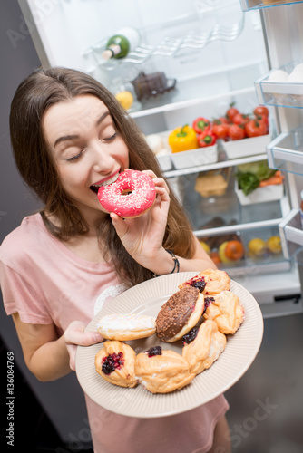 Young woman in the sleepwear eating sweet donuts near the refrigerator