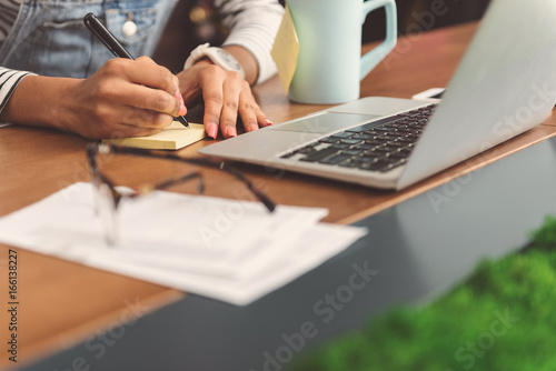 Young woman is making some notes in cafe