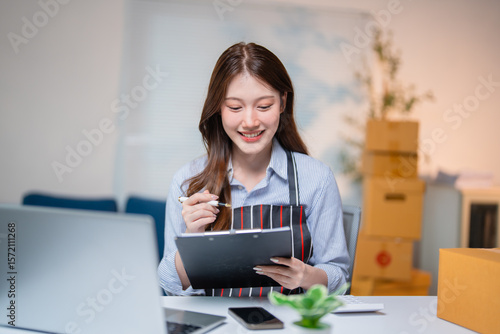 Young woman managing her online business from home, checking orders on a clipboard. Surrounded by a laptop, smartphone, and shipping boxes, she is focused on her work