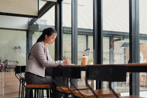 Young woman sitting and working in a cafe