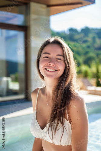 Young woman smiling by the poolside on a sunny day, enjoying a relaxed outdoor atmosphere.