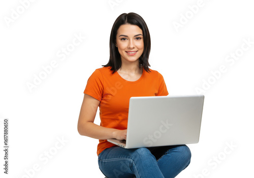 Young woman smiling while using a laptop isolated on transparent background
