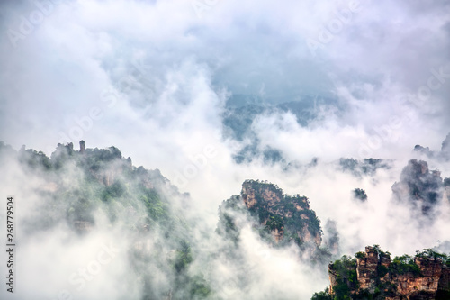 Zhangjiajie National park. Famous tourist attraction in Wulingyuan, Hunan, China. Amazing natural landscape with stone pillars quartz mountains in fog and clouds