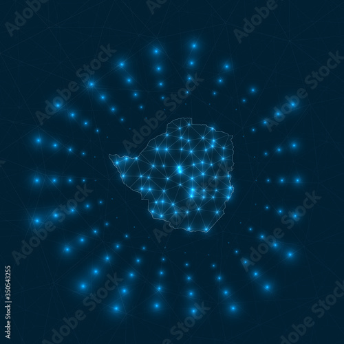 Zimbabwe digital map. Glowing rays radiating from the country. Network connections and telecommunication design. Vector illustration.