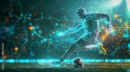 "A futuristic, digital representation of a soccer player in action, surrounded by dynamic, glowing data elements on a dark background."