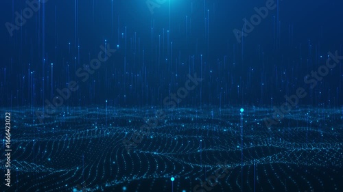Abstract animation digital waves pulsing grid particles rise upward. Use of this clip enhances futuristic themes, tech visualizations, data simulations, motion background, modern science fiction scene