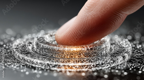 Close-up fingertip pressing glowing digital holographic interface button with network connections and tactile glass texture concept of digital interaction and data touch technology