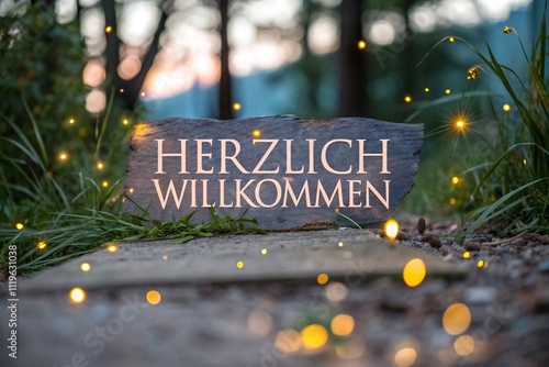 "Herzlich Willkommen" text on a wooden sign surrounded by a magical forest scene with glowing lights, symbolizing hospitality and nature.