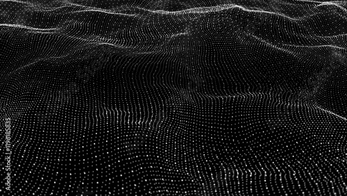 Abstract wave surface formed by glowing white dots on a dark background, representing digital landscape or tech field.