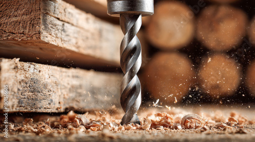 Metal drill bit boring into rough wooden planks producing wood shavings and dust with blurred logs in the background under warm lighting conditions
