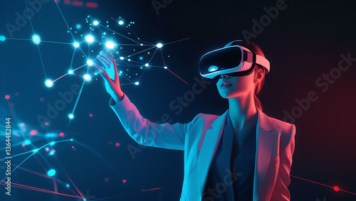 "Woman Experiencing VR & Metaverse Technology in a Futuristic Workplace"