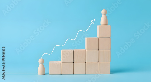 Wooden cubes building stairs, one person is standing at the bottom and the other men is standing on top, different positions