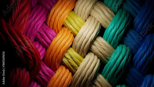 Team rope diverse strength connect partnership together teamwork unity communicate support. Strong diverse network rope team concept integrate braid color background cooperation empower power.