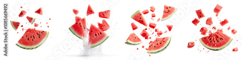 Exploding watermelon pieces on black background isolate on transparent