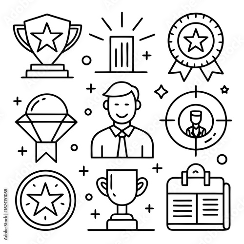 "Black and white line icons for employee rewards: trophy, bonus, recognition star, incentive gift, loyalty badge, and award medal."