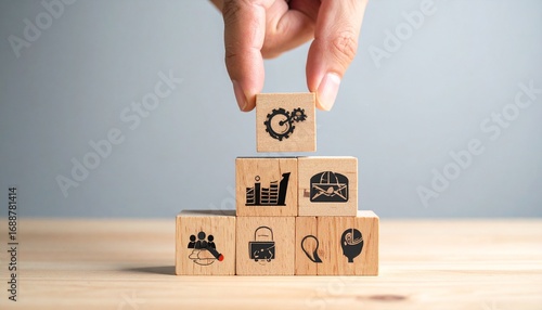 Wooden blocks on balance scale showing value and price icons, concept of cost, worth, business decision, financial strategy, customer perception Block.